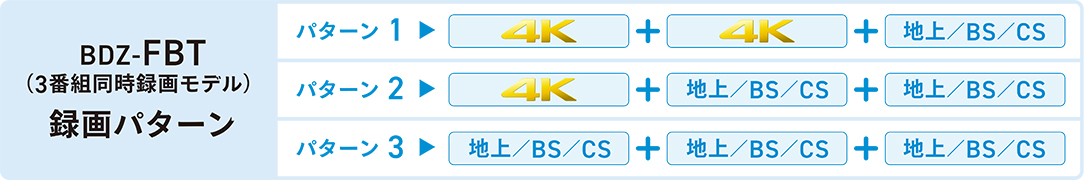 ソニーのブルーレイは、すべてのチューナーが「4K/ハイビジョン兼用」だから、チューナーを意識することなく、いつでも使いやすく同時録画が可能です。