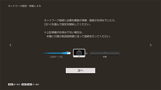 本機をネットワークに接続するための手順を、テレビ画面でわかりやすくガイド。ステップごとにイラスト付きで表示するので、有線LANでも無線LANでも悩むことなく設定が完了します。