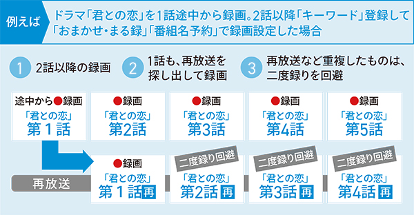 「おまかせ・まる録」「番組名予約」設定すると、同じ番組の同一話(再放送など)の重複録画をかしこく回避します(*)。二度録り回避設定をOFFにすることも可能です。