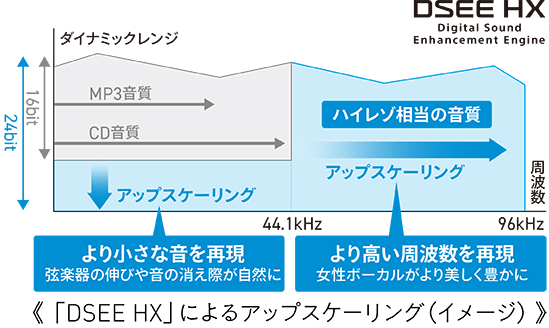 デジタル音声の多くは、耳に聞こえにくい音を省略しています。そこで、圧縮された音声を独自技術「DSEE HX」によりハイレゾ(最大96kHz/24bit)相当に復元。テレビの音声も、よりくっきりと臨場感にあふれた音で再生されます。