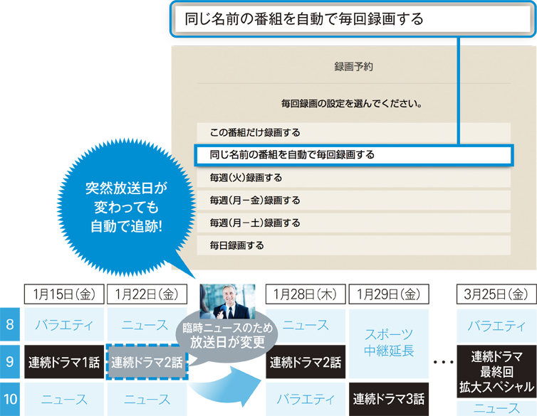 番組予約時に、画面上の「毎週録画する」「毎日録画する」を選んでおくだけ。定期的に放送される「連続ドラマ」や「アニメ」など、見逃したくない番組の録り逃しを回避します。