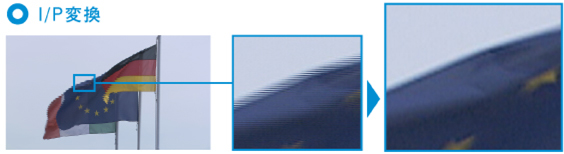 インタレースからプログレッシブへの変換の際、横方向に現れるシマ模様を低減。斜め線のギザギザを補正してスムーズなラインにします。