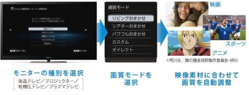 使っているモニターの種類と、お好みの画質モードを選択しておくだけ。後はブルーレイディスクレコーダーが再生している映像素材を識別し、いつでも最適な設定に自動調整してくれます。