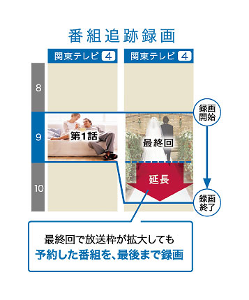 電子番組表(EPG)の番組放送時間が変更されたり、番組タイトルが短縮されたりした場合でも、番組名を追いかけて、しっかりと録画します。また、放送時間の変更を自動で検出し、録画の開始時刻と終了時刻を調整します。