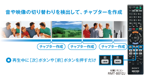 録画中に、音や映像の切り替わりを検知して、自動的にチャプターを作成(*)。3番組同時録画でも、それぞれに「おまかせチャプター」が機能します。再生時に「次」ボタンや「前」ボタンを押せば、見たいシーンを簡単に探せます。