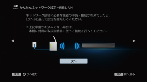 ブルーレイディスクレコーダーをネットワークに接続するための手順を、テレビ画面でわかりやすくガイド。ステップごとにイラスト付きで表示するので、有線LANでも無線LANでも悩むことなく設定が完了します。