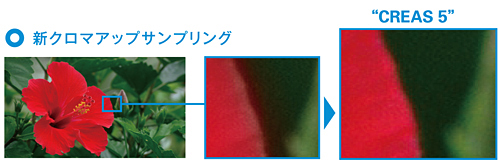 データ圧縮時に失われた色信号を従来より解析範囲を広げ、より精度の高い色補完を実現。滑らかかつ、キレのある色を再現します。