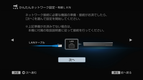 ブルーレイディスクレコーダーをネットワークに接続するための手順を、テレビ画面でわかりやすくガイド。ステップごとにイラスト付きで表示するので、有線LANでも無線LANでも悩むことなく設定が完了します。