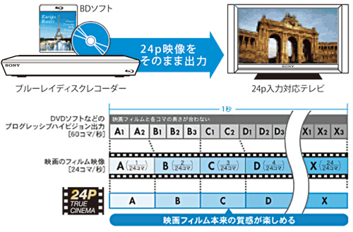 市販のBDソフト(BD-ROM)に収録された、オリジナルフィルムと同じ毎秒24コマのプログレッシブハイビジョン映像(24p)のHDMI出力に対応。24p入力に対応したテレビとHDMIケーブル(別売)で接続すれば、映画本来の質感で楽しめます。