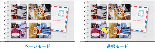 x-ScrapBookは再生モードが2つあります。1つは「ページモード」で、最初はこのモードになっています。左右ボタンでアルバムのページをめくる ように表示することができます。もう1つは「選択モード」です。こちらは1ページの中にある特定の写真やムービーを全画面で表示・再生できるモードです。