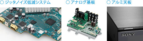 デジタル音声信号処理のトータルシステム「ジッタノイズ低減システム」を搭載し、HDMI音声出力を高音質化。アナログ回路ではジッタエリミネーション回路を搭載し、信号に含まれるジッタをD/Aコンバーターの直前で除去。音質に有害なジッタノイズを徹底して低減しました。また、アナログ回路を専用独立基盤にすることでデジタルノイズの混入を防止。さらに4mm厚のアルミ天板や偏心インシュレーターなどを採用することで音質に悪影響を及ぼす振動を抑えています。