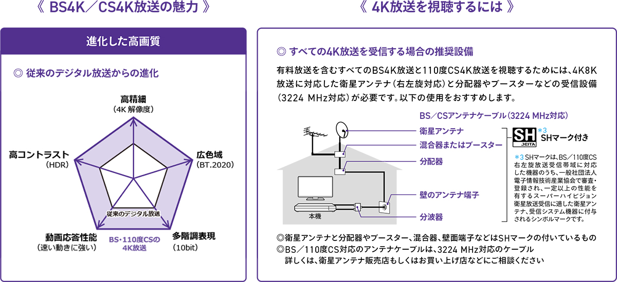 *1 BS・110度CSによる4K・8K衛星放送について。BDZ-FBT4200/FBT2200/FBW2200で「BS・110度CSによる8K衛星放送」を受信する機能は搭載しておりません *2 BS放送がすべて視聴できている場合、現在ご使用中の衛星アンテナと伝送機器のままで、NHKと民放キー局系のBS4K放送(右旋放送)を視聴できます。さらに、すべてのBS4K放送と110度CS4K放送を受信するには、別売の4K8K放送に対応した衛星アンテナ(右左旋共用)とブースターや分配器、壁面端子、分波器などの伝送機器(3224MHz対応)が必要です