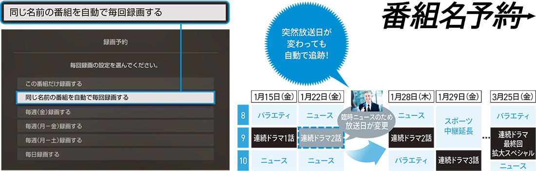 * 「番組名予約」のアルゴリズムで判別できない番組名変更には対応できません