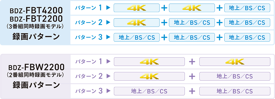 *1 BDZ-FBW2200は、4K放送の2番組同時録画対応(地上/BS/110度CS放送は2番組同時録画対応です) * 2 4K長時間録画モードの録画は、一旦、DRモードで録画した後、指定した録画モードに自動変換します BS4K/CS4K放送の録画・視聴に関する注意事項 ◎4K放送2番組同時録画中に他の4K放送を視聴することはできません ◎ブルーレイディスク/DVDへ直接録画することはできません ◎SeeQVault(TM)対応外付けハードディスクへ録画/ダビングすることはできません ◎4K放送録画番組の「お引越しダビング」は使用できません ※ 本機はブルーレイディスクアソシエーション(BDA)によりライセンスされるBS4K/CS4K放送の番組をBD-R/BD-REディスクに記録できるブルーレイディスク(TM)規格に準拠しています。本機はMMT/TLV多重化方式での記録、再生には対応していません