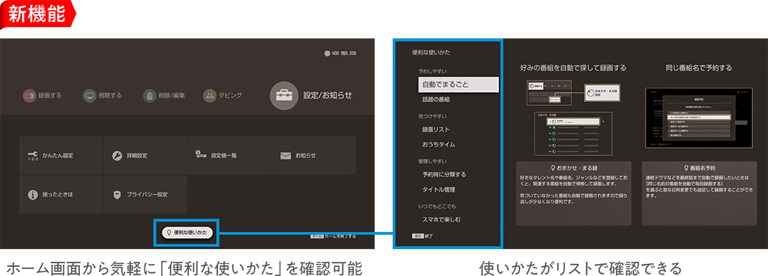 レコーダーのホーム画面下部から便利な使いかたを気軽に確認可能。番組を予約しやすい方法や、見つけやすい方法など、知っておくと便利なレコーダーの使いかたを表示します。