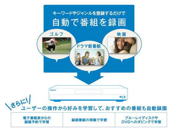 好きなタレントの名前や、興味のあるジャンルなどを登録するだけで、条件に合った番組を探して自動で録画します(*)。膨大な番組の中に埋もれて気づかなかった番組も録画しておいてくれます。