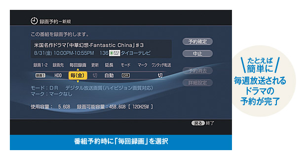 番組予約時に、画面上の「毎回録画」を選んでおくだけ。次回からの予約の手間が省けます。