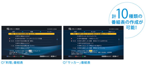 興味のあるジャンルや、好きなタレントの名前などを登録しておけば、関連する番組だけを集めた自分専用の番組表を自動作成(*)。見たい番組を素早く探し出せて、録画予約も簡単にできます。