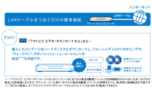 ブロードバンド回線に接続して、家にいながらハイビジョンの映画やドラマ作品を購入し、楽しめます。さらに「アクトビラ ビデオ・ダウンロードセル」なら、購入したコンテンツをハードディスクにダウンロードし、ブルーレイディスクへのダビングや、“ウォークマン”、PSP(R)「プレイステーション・ポータブル」への転送(*2)(*3)も可能です。