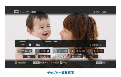 映像を取りこんで編集し、思い出の名場面集を簡単に作れます。映像をハードディスクに取りこむ際に、撮影の開始点を自動で検出してチャプターを作成。「チャプター編集画面」で、分割、結合、削除といった編集が簡単に可能です(*2)。