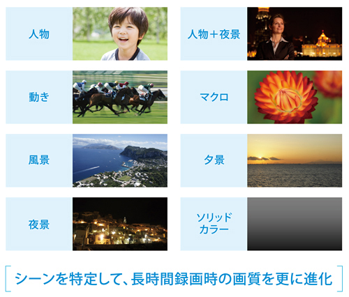 映像信号を解析して自然の風景、夜景、動き、人物などといったシーンを特定。それぞれに最適なエンコーディングを行いながら録画することで、長時間でもより高画質に記録できます。
