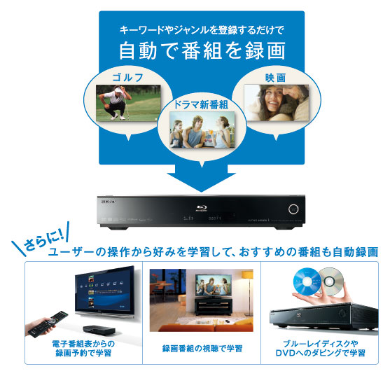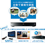 興味のあるジャンルや、好きなタレントの名前などを登録するだけで、条件に合った番組を自動で探して録画します。さらに、録画番組の再生やダビングなどの操作からユーザーの「好み」を学習して、おすすめの番組も自動録画。膨大な番組の中に埋もれて気づかなかった番組も楽しめます。