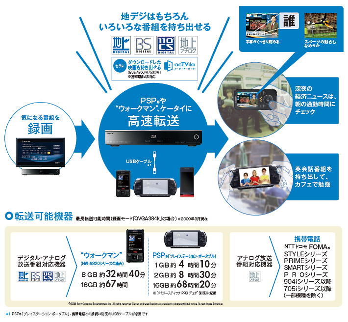 ハードディスクに録画した番組を“ウォークマン”やPSP®「プレイステーション・ポータブル」に転送して外に持ち出せます。たとえば朝の通勤電車の中で、深夜のニュース番組や語学番組などを視聴。「おまかせチャプター」で自動的に打たれたチャプターも転送*3されるので、見たいシーンを素早く探せます。転送した「1回だけ録画可能」な番組を「おかえり転送」でブルーレイディスクレコーダーに戻せば、テレビの大画面でオリジナル画質のまま再生できます。*4なお、ハードディスクに録画したアナログ放送番組などのコピー制御信号を含まない映像なら、携帯電話(NTTドコモのFOMA®の一部機種)にも転送可能です。*5
