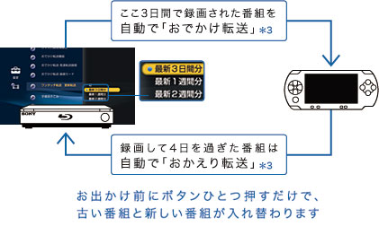「更新転送設定」で選んだ期間に合わせて、“ウォークマン”などの転送先の番組を常に最新の状態にすることが可能です。たとえば「最新3日間分」に設定し、「ワンタッチ転送」を行うと、3日以内に録画された番組のみを「おでかけ転送」できます。その際に、転送先の古い番組(録画してから4日を過ぎた番組)は自動的にレコーダーに「おかえり転送」されます。