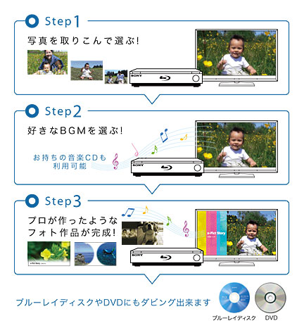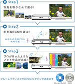 デジタルスチルカメラで撮影した写真を取りこんで*1BGMを選べば、曲調に合わせたビデオクリップのような作品を自動作成。ブルーレイディスクにハイビジョン画質で保存できます。また、DVDには標準画質で保存できます。さらに、お持ちの音楽CDの曲をBGMに設定可能です。