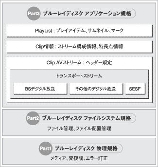 という、3パートに分かれ、図8のようなレイヤー構成になっています。この中で、映像・音声などのデータ列(ストリーム)をファイルとしてディスクに記録する方法を定めたものが、ファイルシステムのパートです。また、ストリームの形式やストリームを管理するデータベースについてのルールを定めたものが、アプリケーションのパートです。アプリケーションのパートでは、ブルーレイディスク規格に準拠するレコーダー・プレーヤーが備えるべき機能を定義するとともに、基本的なユーザーインターフェースを定めています。