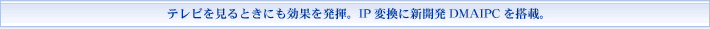 高画質なプログレッシブ映像を実現する、新開発DMAIPC(Dual Motion Adaptive IP Convertor)。通常、DVDやテレビ放送には、ビデオカメラで撮影されたものと、映画などフィルムで撮影されたものがあります。映像がビデオ素材(480i)の場合、DMAIPCは時間方向(フィールド間、フレーム間の両方)と空間方向の双方から動きを検出。さらに、画素単位だけでなく面単位でも動き検出を行い、その結果を反映させた補間処理により、動いている部分も解像度を向上させます。一方、映像がフィルム素材(480i)の場合、映像に記録されているフィルムのコマ情報(フラグ)による制御と、フラグ欠落時の自動検出による制御を行い、フィルムの1コマ1コマを高精度に再現します。このように、DMAIPCは、DVD、BSデジタル放送(480i)、外部入力(アナログ)など、様々な映像の素材(ビデオ/フィルム)に応じて最適なプログレッシブ変換をその都度行っています。