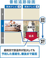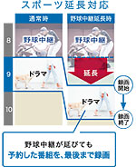 録画予約した番組の前に野球・サッカーなどの放送がある場合、電子番組表(EPG)から試合中継の延長時間を読みとって、録画時間を延長します。