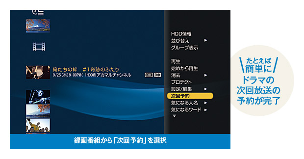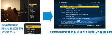 録画番組の再生中やデジタル放送の視聴中に「この出演者の他の番組を見たい」「このトピックに関する他の番組を見たい」と思ったら、その場で検索。画面に表示される出演者名などを選ぶだけで瞬時に関連する番組が表示され、素早く簡単に録画予約できます。