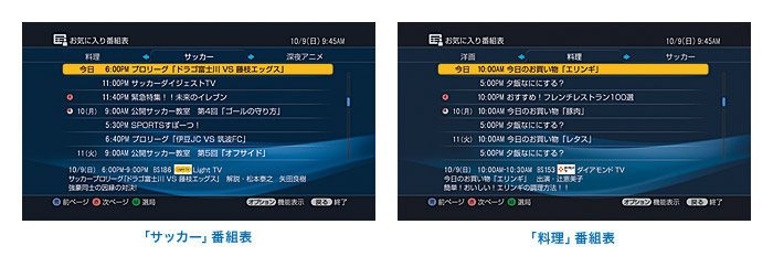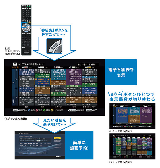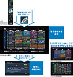地上・BS・110度CSデジタル放送、地上アナログ放送に対応した電子番組表。新聞のテレビ欄を見るように番組を探せます。さらに、見たい番組を画面上の番組表から選ぶだけで録画予約できます。
