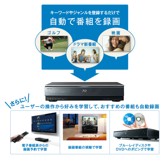 興味のあるジャンルや、好きなタレントの名前などを登録するだけで、条件に合った番組を自動で探して録画します。さらに、録画番組の再生やダビングなどの操作からユーザーの「好み」を学習して、おすすめの番組も自動録画。膨大な番組の中に埋もれて気づかなかった番組も楽しめます。