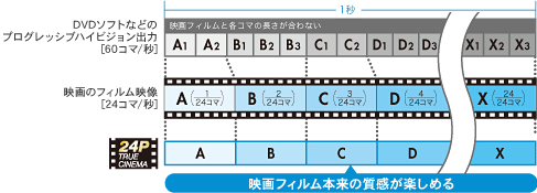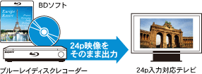 映画のオリジナルフィルムと同じように毎秒24コマのプログレッシブハイビジョン映像(24p)を収録したBDソフトに対応。24p入力に対応したハイビジョンテレビ〈ブラビア〉とHDMIケーブル(別売)で接続すれば、24p映像をそのまま出力するので、映画本来の質感で楽しめます。