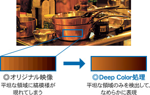 色が平坦な領域を検出して、256階調(8bit)の映像信号を、4096階調相当(12bit)に変換。HDMIケーブル(別売)※1で、Deep Color入力に対応したテレビと接続すれば、よりなめらかな映像が楽しめます。