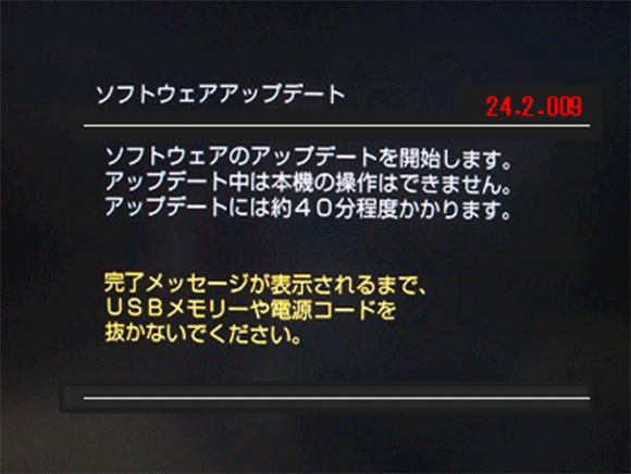 ・アップデート中、BDレコーダーの電源コードやUSBメモリーを抜いたりしないでください。故障の原因になります。