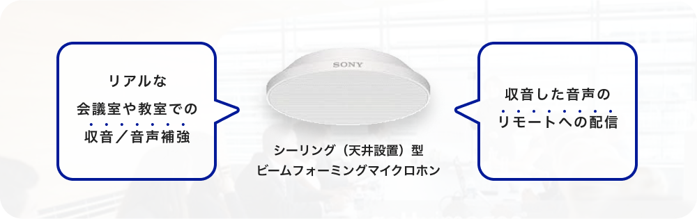 ソニーは、業務用マイクロホンで培ってきた音声技術搭載の天井設置型ビームフォーミングマイクロホンをコアにして、オフィスのリモート会議を行う会議室や、ハイブリッド型授業を行う教室に、適した音響環境を提供します。