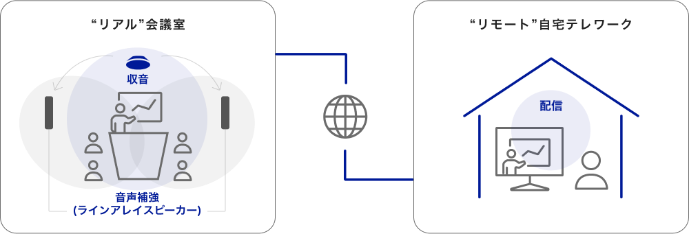 “リアル”と“リモート”で違和感なくコミュニケーションができることはもちろん、さらに一体感を醸成するためには発言者のスピーチ音声をいかに明瞭に収音し、拡声できるか、そして伝えられるかが一番のポイントです。