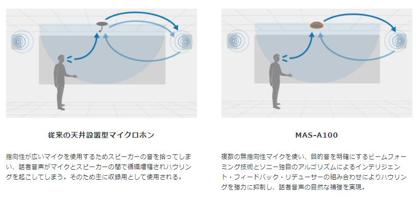 MAS-A100はソニーが業務用マイクロホンで培ったインテリジェント・フィードバック・リデューサーと先進のビームフォーミング技術を搭載。これらの最新技術によってハウリングを抑制することで、これまで天井設置型マイクロホンでは難しかった話者音声のスピーカー出力を実現し、聴講者は自然な感覚でエンハンスされた話者音声を聞くことができます。