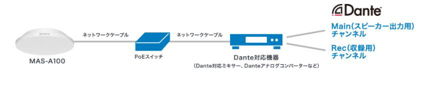 Audinate社が開発したデジタルオーディオネットワークの規格“Dante”に対応し、1本のネットワークケーブルを通じてスピーカー出力用と収録用の2チャンネルの音声を同時に出力することができます。教室内でのスピーカー出力を行うと同時に講義・講演をクリアな音声で収録する、といった使い方が可能です。