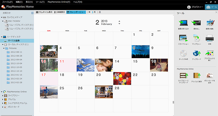“PlayMemories Home”を使えば、撮った映像を「カレンダー表示」でかんたんに整理・検索・再生できます。さらに、フォルダやラベルなど異なる分類で一覧表示できる「リストビュー」、動画を一定間隔ごとにサムネイル表示する「フィルムロールインデックス」など便利な検索機能が充実。見たい映像をスムーズに見つけることができます。