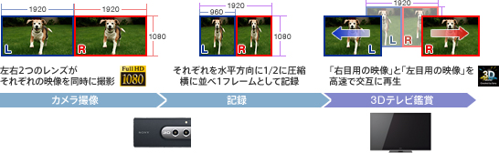 “ブロギー3D”は、コンパクトながら高性能レンズを2眼と510万画素 “Exmor”CMOS(エクスモア シーモス)センサーを2枚搭載。左右2つのレンズで撮影した映像を水平方向に1/2に圧縮し、1フレームとして記録する左右分割方式(サイドバイサイド方式)による3D撮影に対応しています。2つの高性能レンズに加え、イメージセンサーを2枚搭載したことで、より高画質の3D撮影を実現。3D動画はハイビジョン記録が可能です。