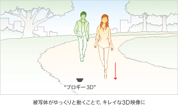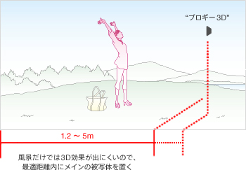 映像に3D効果を出すためには、メインの被写体をカメラから約1.2〜5mの距離に置くことが大切です。また、複数の被写体を最適距離内に置くとより3D効果が得られます。