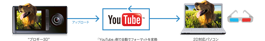 本体内蔵の「Bloggie ソフトウェア」を使って「YouTube」にアップロードすれば、2D対応のパソコンでも3D映像が手軽に楽しめます。 “ブロギー3D”で撮影した映像なら、「YouTube」にアップロードするだけで「YouTube」側でフォーマット変換されます。