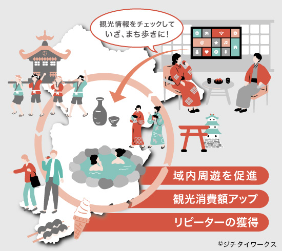 飲食店だけでなく、イベントや祭りなどの情報も配信できるため、宿泊客をまち歩きへとスムーズに誘導。土産物店やスイーツ店など、観光による経済効果は温泉地全体に広がっているそうだ。「最近では、住民向けだけで商売をしていた人が、観光客向けの飲食店をオープンさせて大成功した事例もあります。なるべく多くの事業者が観光事業にも乗り出すことで、地域経済を安定的で、持続可能なものにすると考えています」。