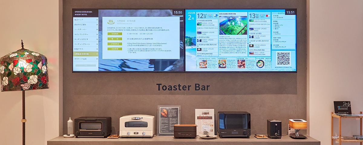 サイネージではホテルの施設案内やイメージ画像、災害発生時には避難場所なども表示しますが、注目いただきたいのは、パンの焼き上がり時間をお知らせしていることです。地域の旬な情報をピックアップし表示していますが、より詳しい情報は表示された二次元コードから、お客様がご自身のスマートフォンで専用情報サイトへアクセスし、見ていただく仕組みになっています。案内板のような一方向的な使い方ではなく、能動的に情報を取りに行く双方向的なスタイルが、さらなる価値や効果を生むと考えました。地域住民に人気のお店や知る人ぞ知るイベントが楽しめることを、お客様は大変よろこばれています。だから「おもてなし」になっている。それが可能なサイネージなんて、法人向けブラビアだけではないでしょうか。