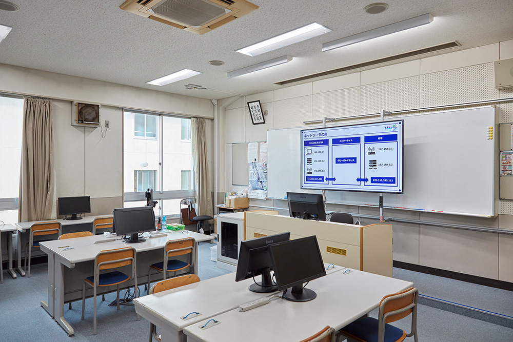 地元では「滝二」の愛称で親しまれ、約800人の高校生と約300人の中学生が在学しています。学問的素養だけでなく、心の成長にも期待した教育活動を推進。探究活動を中心に、中学校では実験や実践的な体験・学外活動などに、高等学校では生成AIの活用など好奇心をかきたてる授業に注力しています。本学では早くからICT機器の活用も重視するなど学習環境の整備を推進してきましたが、設置していたプロジェクターが古くなり買い替えの時期を迎えていました。そのため活用方法の変化も意識し、大型提示装置は今後どうあるべきなのか学習環境を向上させたいと考えました。