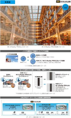 ネット動画など、あらゆるコンテンツを高精細な映像に作りかえる超解像エンジン「4K X-Reality PRO(4K エックス リアリティー プロ)」を搭載。ハイビジョン映像を4Kにアップコンバートするデータベースと、4K映像をさらに高精細化するさまざまな映像に対応したデータベースを参照することで、最適な高精細化処理を行います。